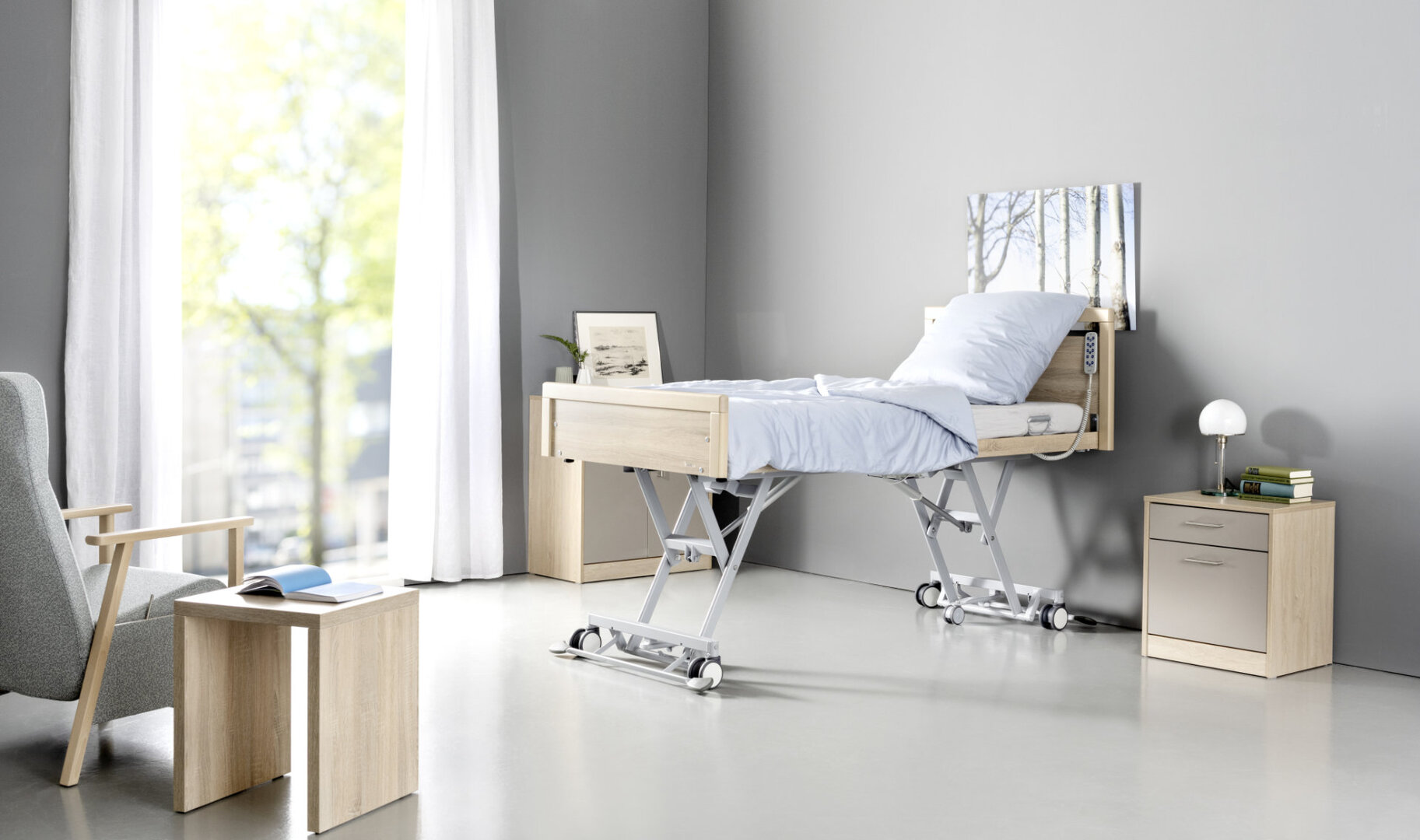 Das practico 25|80 plus verbindet Pflegekomfort mit wohnlicher Ästhetik. Erhältlich in verschiedenen Holzdekoren, auf Wunsch auch mit Stoffpolster, fügt es sich harmonisch in jedes Wohn- oder Pflegezimmer ein. Große Doppellenkrollen mit Zentralverriegelung sorgen für einfaches Manövrieren und sicheren Stand.