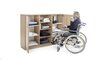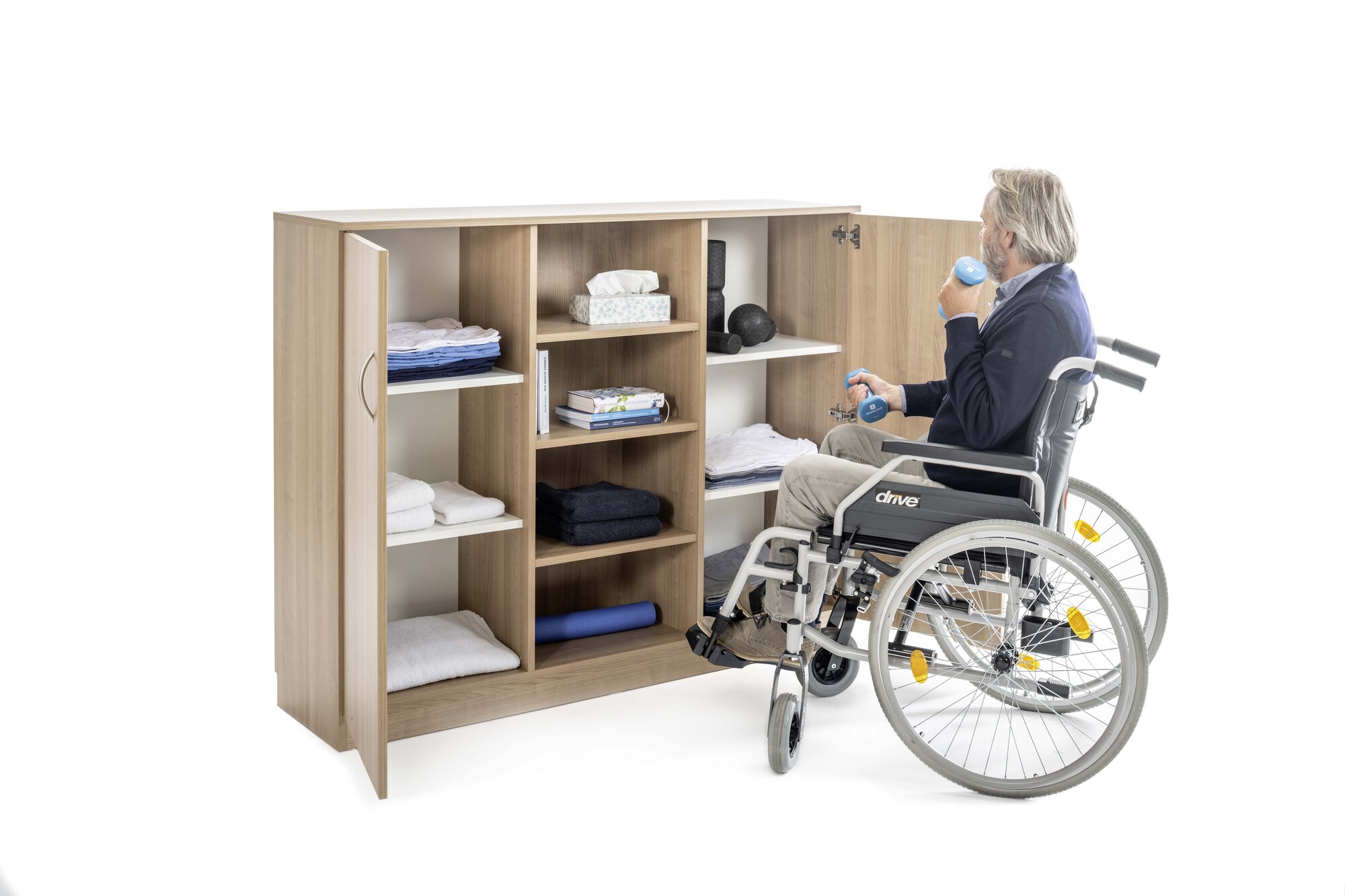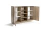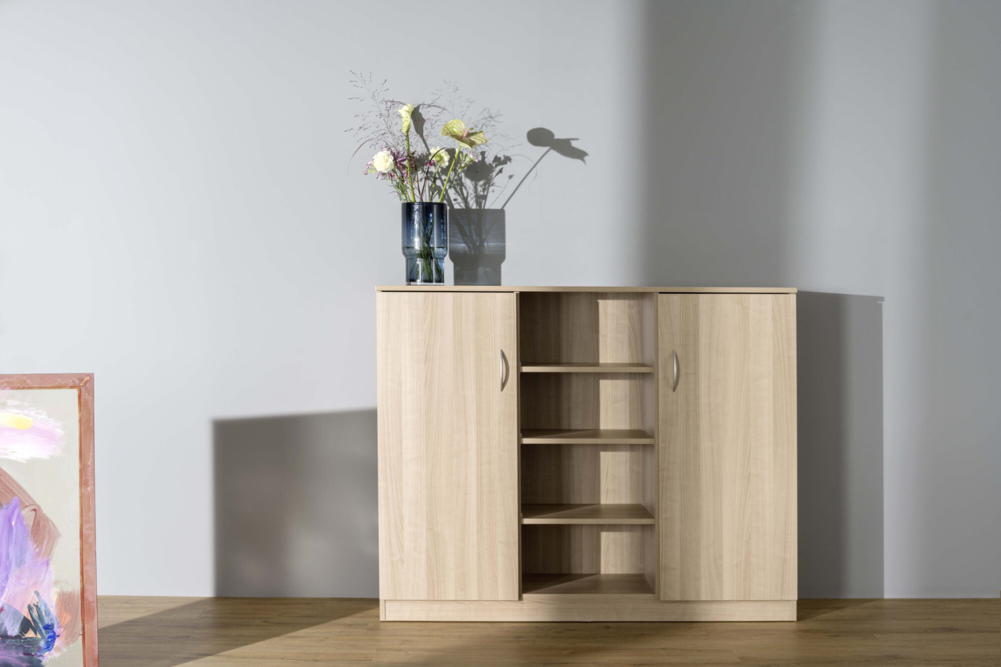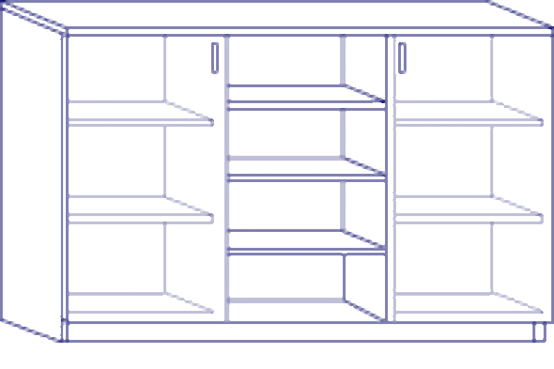 Mitte offen, 3 Einlegeböden, rechts und links eine Flügeltür, dahinter 2 Einlegeböden