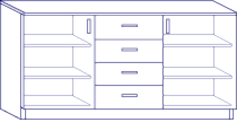 Mitte 4 Schubkästen, rechts und links eine Flügeltür, dahinter je 2 Einlegeböden