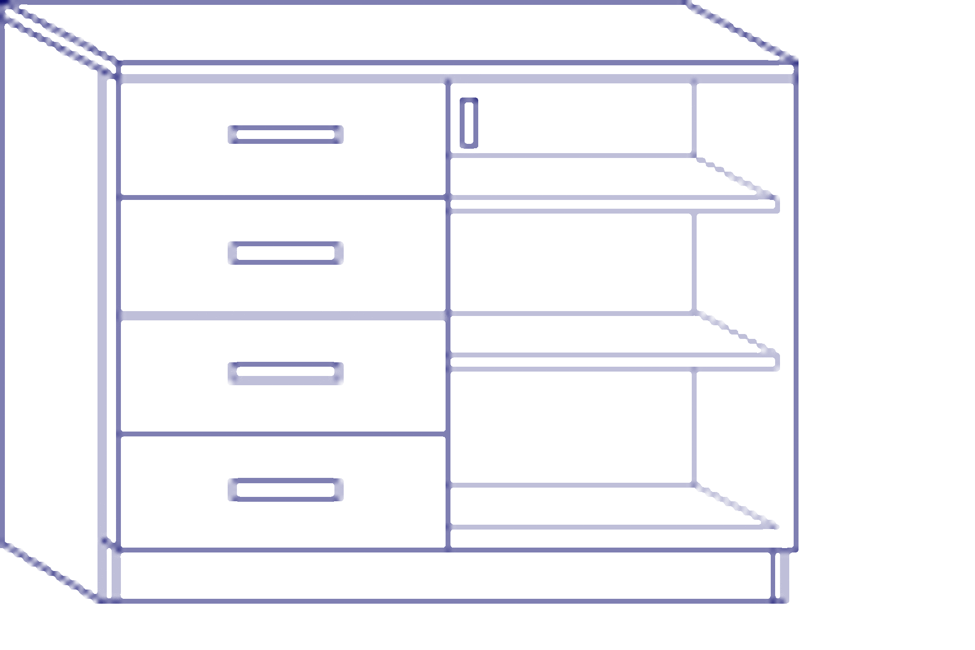 links 4 Schubkästen, rechts eine Flügeltür, dahinter 2 Einlegeböden
