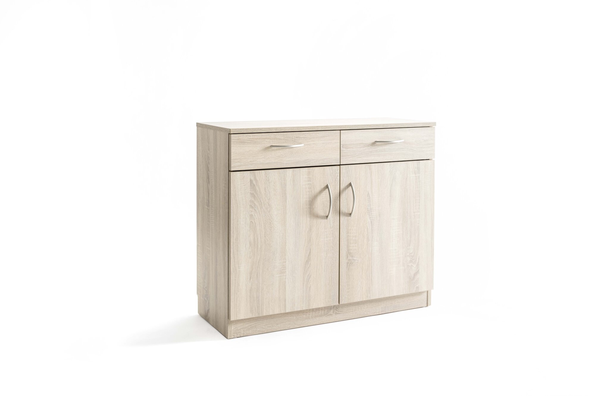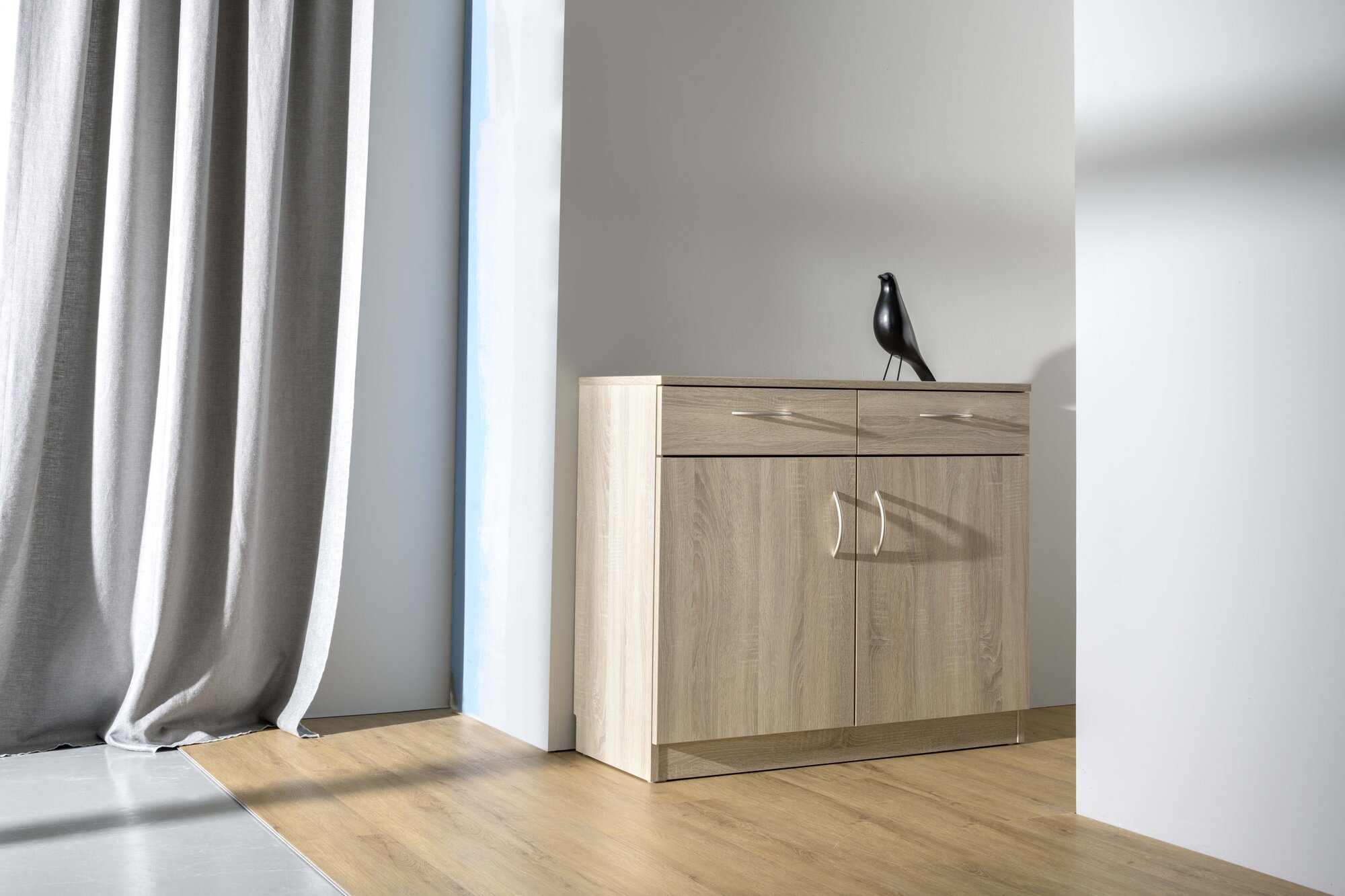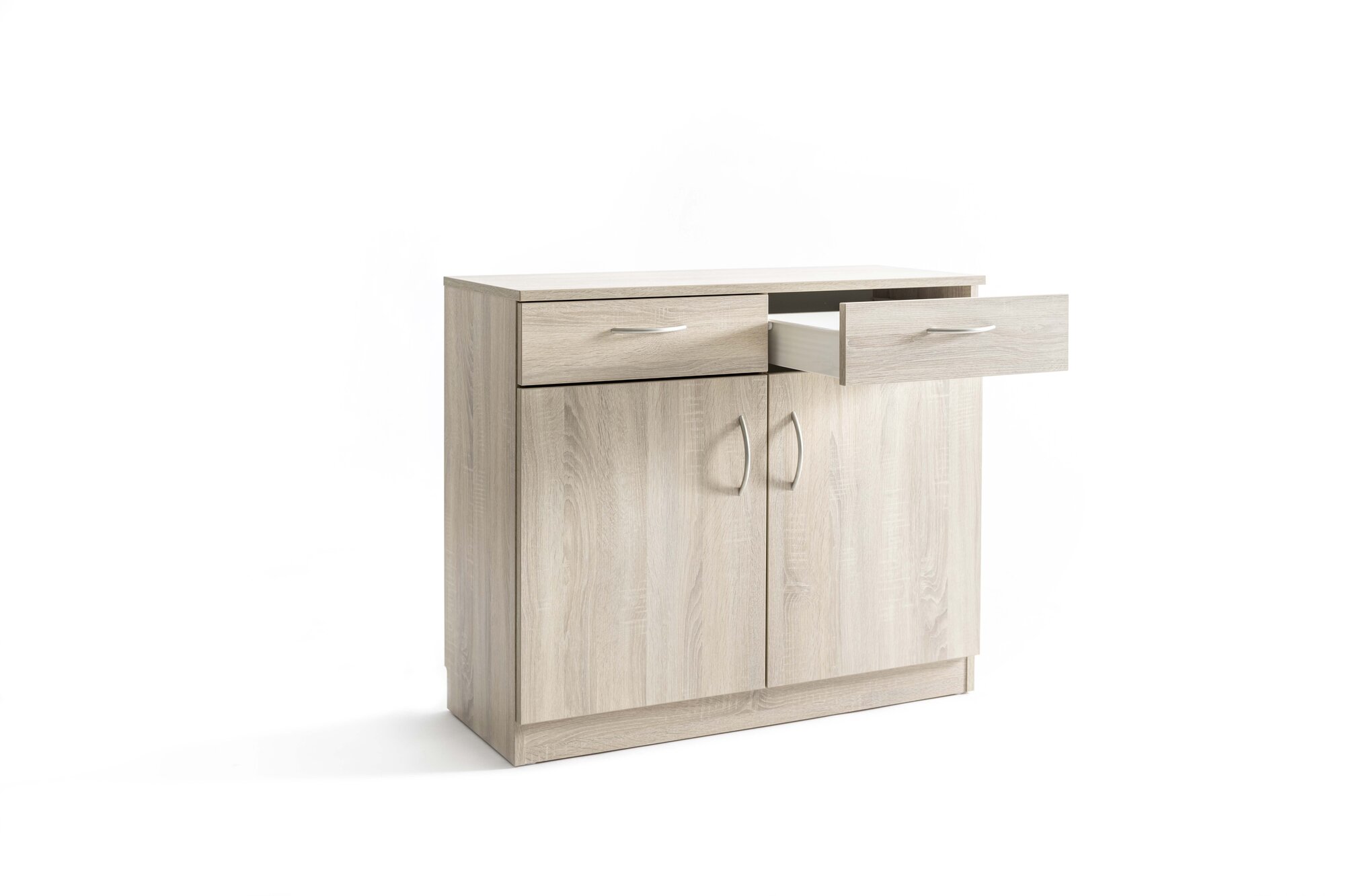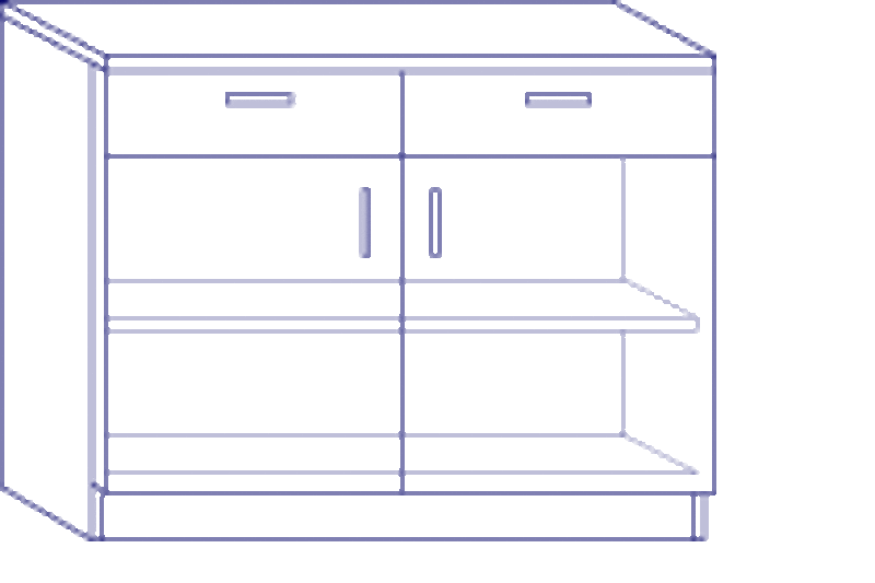Rechts und links ein Schubkasten und eine Flügeltür, dahinter 1 Einlegeboden